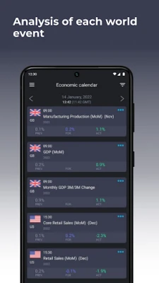 Forex economic calendar is a mobile application that is essential for a Forex trader in order to track, analyze and stay up to date on all market events on the move. Would you like to be notified of the latest economic news? Simply customize the alert and receive up-to-date push notifications in real time. In addition, you can adjust the settings to filter the news feed - both in terms of relevance and impact level. Select only those indicators that directly affect the trading instruments of your choice (for example, EUR, USD, or Gold).